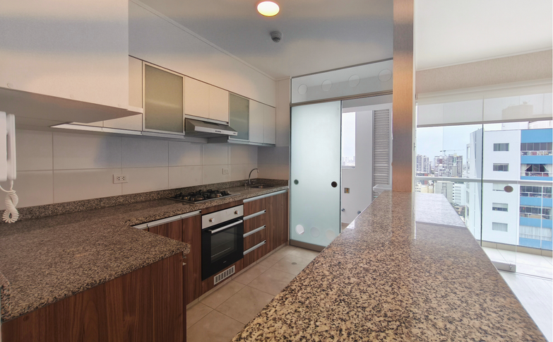 - Cocina abierta con encimera de granito.